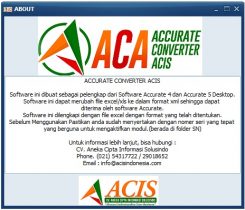 ACCURATE CONVERTER ACIS (ACA) merupakan suatu tools atau alat bantu untuk mengubah transaksi dalam file excel menjadi file XML agar dapat diimpor ke dalam sistem ACCURATE. Jadi tools ACA ini bertujuan untuk mengintegrasikan data transaksi di program excel biasa atau dari program lain seperti Point of Sales (yang dapat diekspor ke format excel) ke dalam sistem ACCURATE, sehingga Anda tidak perlu lagi menginput ulang transaksi-transaksi seperti Jurnal Umum, Sales Invoice, Sales Receipt dan lain-lain yang sudah ada di excel Anda ke dalam sistem ACCURATE. ACA ini juga sangat mudah digunakan, juga disertai dengan format excel yang perlu disiapkan yang sangat mudah dipahami dengan kolom-kolom yang sederhana.