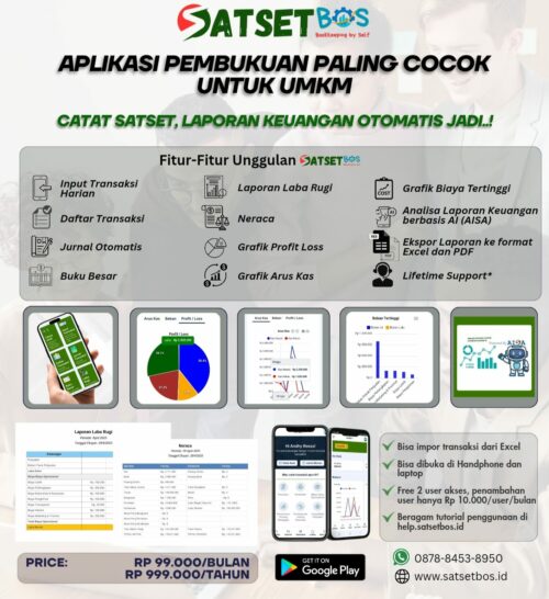 SATSETBOS, merupakan aplikasi pembukuan modern yang praktis untuk UMKM, dalam mencatat transaksi usaha sehari-hari sampai jadi laporan keuangan otomatis. Dengan SATSETBOS, kamu bisa memantau laba rugi usaha real time setiap hari, pantau cash flow, dan semua bisa dilakukan dari handphone kamu. Dengan tampilan simple dan enak dilihat, SATSETBOS sangat cocok digunakan untuk usaha UMKM kamu, jadi tidak perlu catat keuangan manual lagi, semua tinggal input di SATSETBOS.